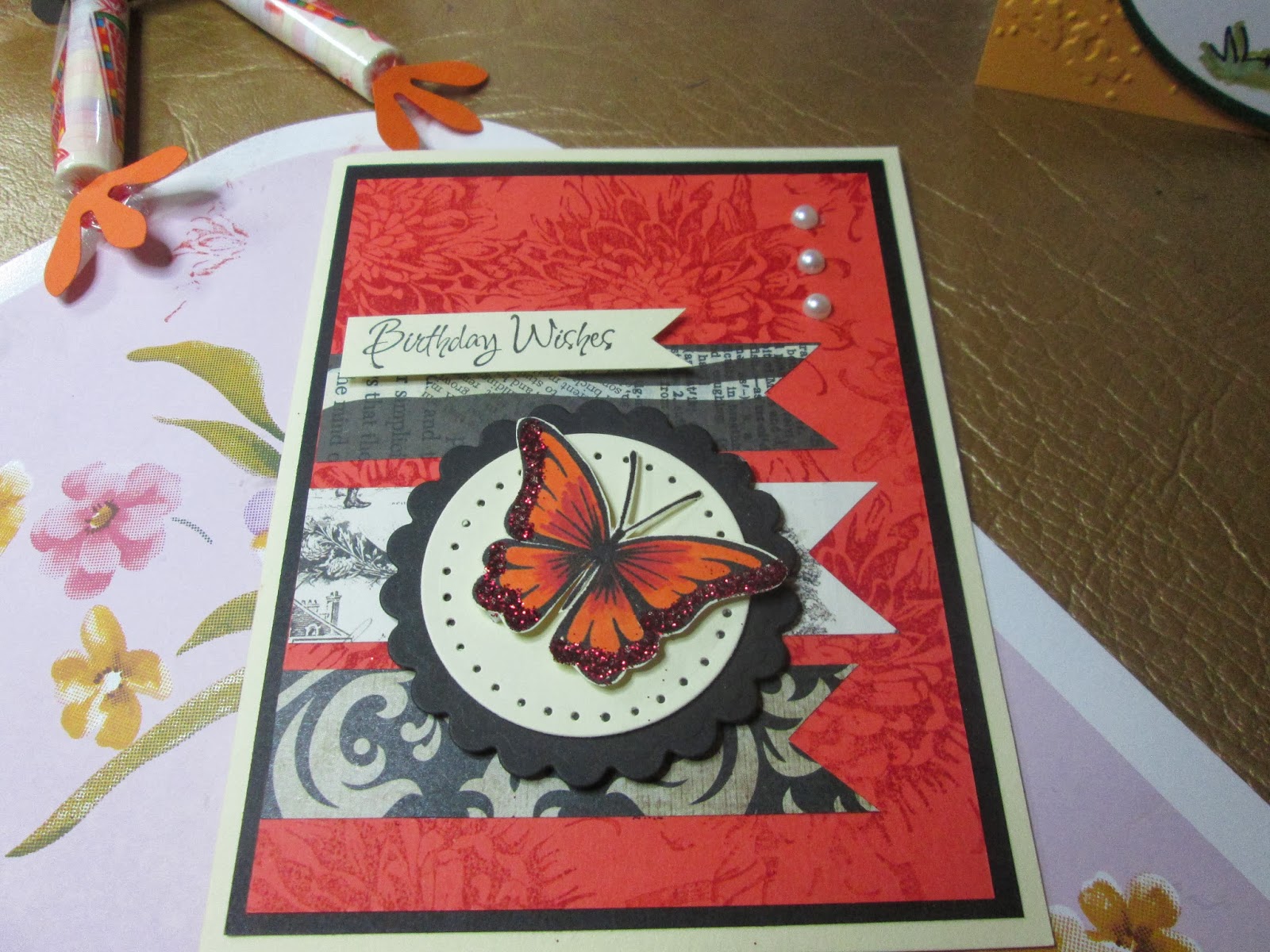 This was a fun card to make, just tabs of paper in different colors, a butterfly punch was used then fitted inside a different colored butterfly. (does that make sense??) Then strips of paper glued at the top and a greeting layered on top with gems to embellish the card.