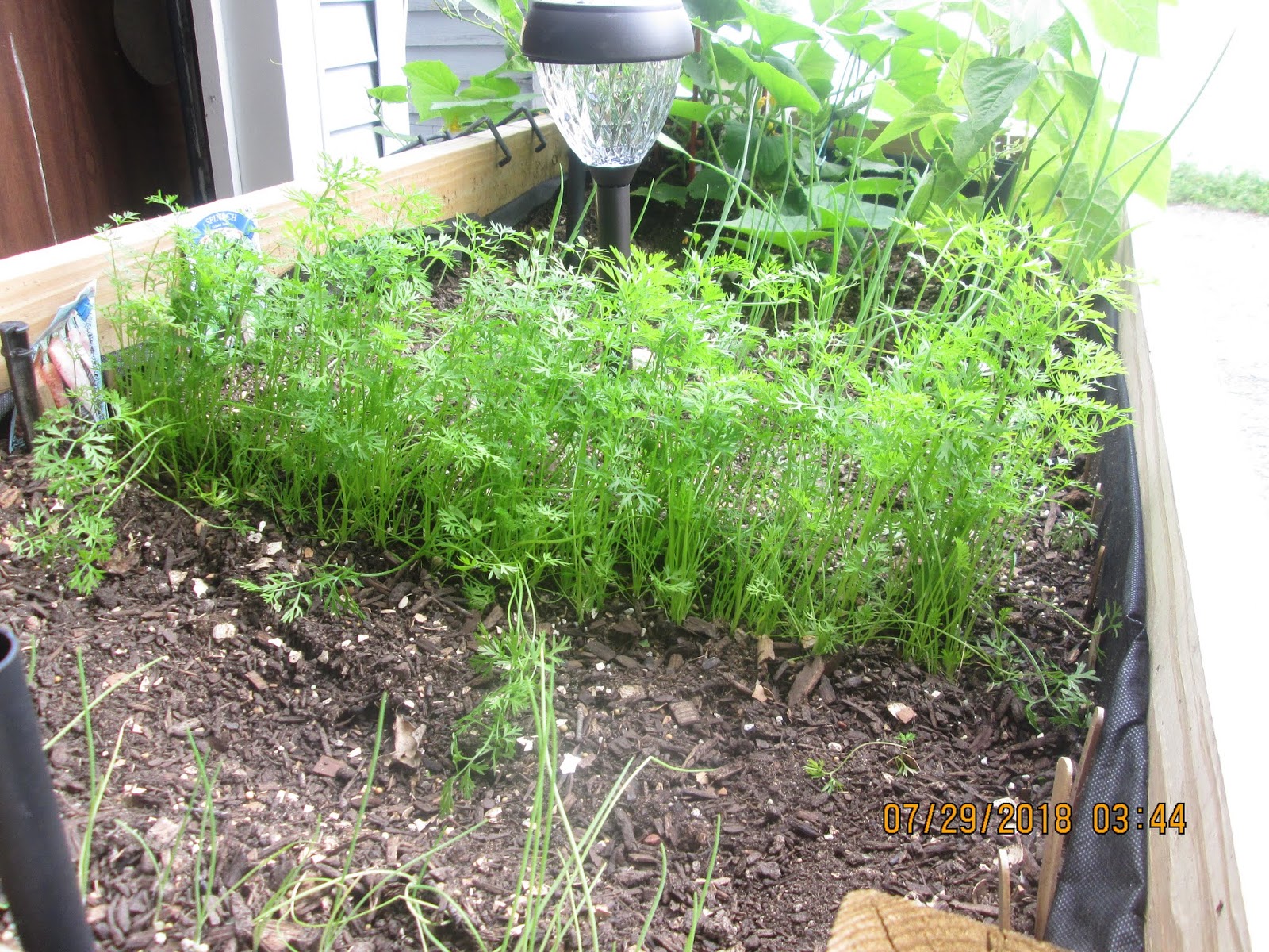 In this planter are onions, carrots, a new planting of radishes, beans, pepper plant and cucumber plant that is really producing an abundance of cucumbers. As I mentioned in a previous post....these plants get the morning and early noon sun.